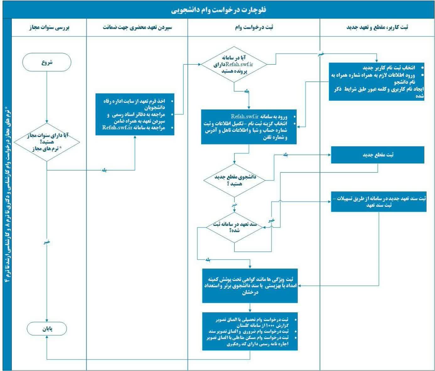 4. تاکید می گردد با توجه اعتبار محدود و متمرکز وام ها،سیر مراحل اخذ وام به هیچ وجه تضمین کننده اعطای وام به دانشجو نمی باشد ودر صورت تکمیل و تحویل مدارک در زمان مشخص و تایید این اداره و تامین منابع مالی از سوی صندوق رفاه دانشجویان و تایید صندوق ، به دانشجویان عزیز وام اعطا خواهد شد. هرچند این اداره طبق معمول تمام تلاش خود را برای گرفتن اعتبار لازم انجام خواهد داد.دانشجویان حتما این مورد را مدنظر قرار دهند.